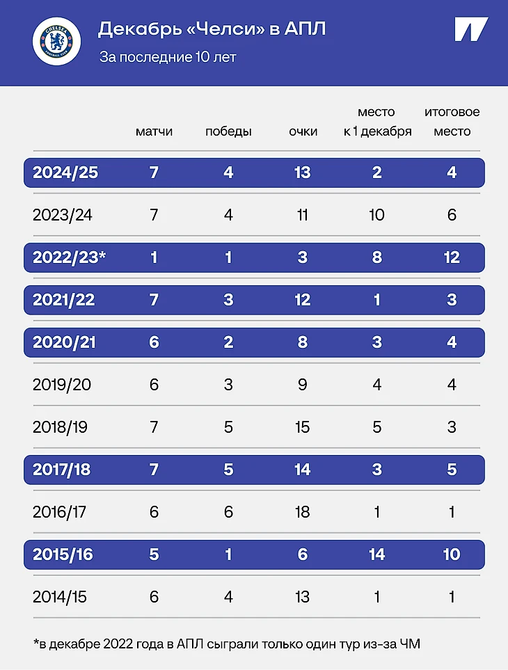 Сезон-2022/23 выносим за скобки: в расписание жестко вмешался зимний чемпионата мира в Катаре. «Челси» после возвращения в единственном матче декабря обыграл «Борнмут» (2:0) при Грэме Поттере.