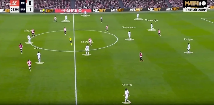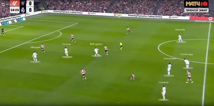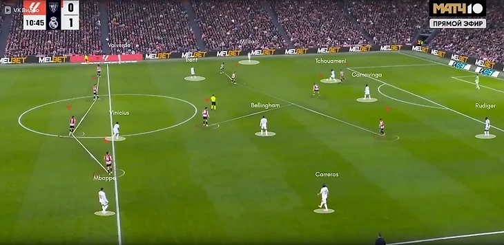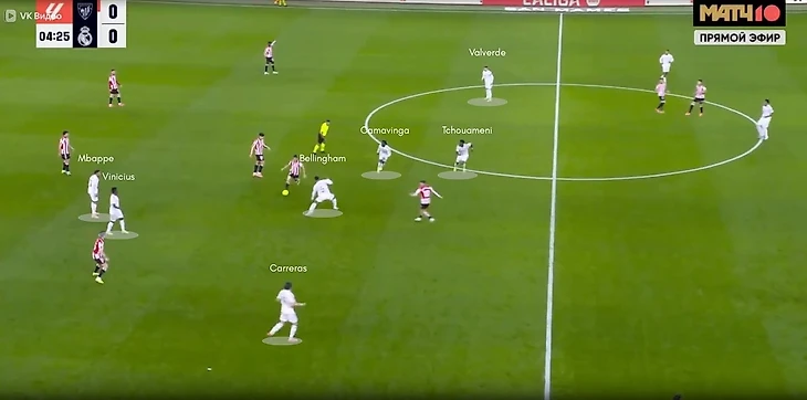 Первый пункт особенно важен: часто можно было увидеть, как Камавинга занимает позицию Тчуамени (как третий ЦЗ/опорный полузащитник), Милитао играет на позиции правого защитника, Мбаппе смещается во фланги, в то время как Вини уходит в центр.