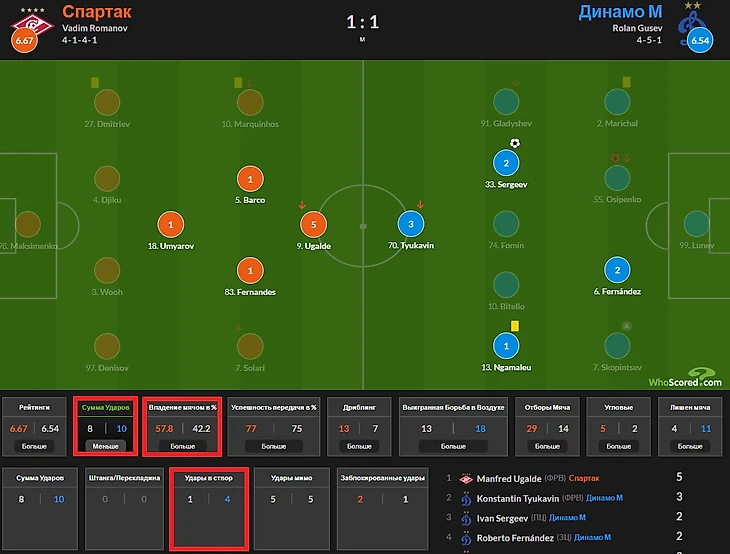 Что же касается игры, то мы увидели достаточно типичную картину для «Спартака» времён Станковича. Серьёзное преимущество в контроле мяча (почти 60 на 40), но - колоссальные проблемы с использованием данного владения.