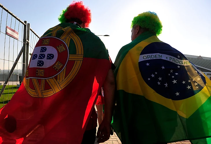 Вы бы согласились с таким определением этого противостояния? А теперь представьте, если обе сборные сыграют друг с другом в финале самого мундиаля 19 июля? Вне всякого сомнения это будет больше, чем просто дерби: в Бразилии официальным языком считается как раз португальский. Но все же между классическим европортугальским и его бразильским собратом определенные отличия имеются. Этому стоит вообще посвятить отдельный пост. Если говорить о противостояниях на ЧМ, то метрополия и бывшая колония играли друг с другом дважды и оба раза – на групповой стадии. Впервые это произошло на ЧМ-66, где Португалия с Эйсебио угодила в одну группу с бразильцами, за которых играл Пеле. И так получилось, что кудесникам мяча пришлось испить чемпионского проклятия: в очной встрече порты разбили 2-кратных на тот момент чемпионов мира 3:1, выиграв вообще все встречи в своем квартете и провернув камбэк против сборной КНДР в 1/8 финала (с 0:3 на 5:3). Спустя 4 года бразильцы все-таки выиграют свое 3-е золото мундиалей, а португальцев не будет слышно на ЧМ вплоть до 1986 г., когда они вновь попадут в финальную часть, но вылетят уже на групповой стадии. Лишь с 2002 г., евробразильцы стали принимать участие на ЧМ регулярно, а в 2010-м во второй раз в своей истории сыграли с южноамериканскими лингвобратьями, но сильнейшего не выявили – 0:0. И на всякий, не будет лишним напомнить о том, что одно время сборную Португалии возглавлял бразилец – Луис Фелипе Сколари, с которым КриРо и Ко дошли до финала домашнего Евро-2004, где уступили грекам.
