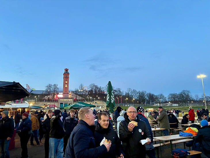 Перед стадионом располагается ярмарка, где находятся вагончики с развлечениями, а также фуд-траки. Несмотря на раннее время, местами уже были очереди.