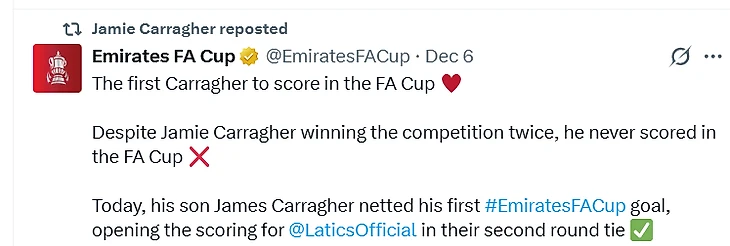 Джим обошел папу и в другом аспекте: стал первым представителем семейства Каррагеров с голом в Кубке Англии. Об этом Джейми тоже сообщил своим подписчикам в X, репостнув публикацию официального аккаунта турнира.