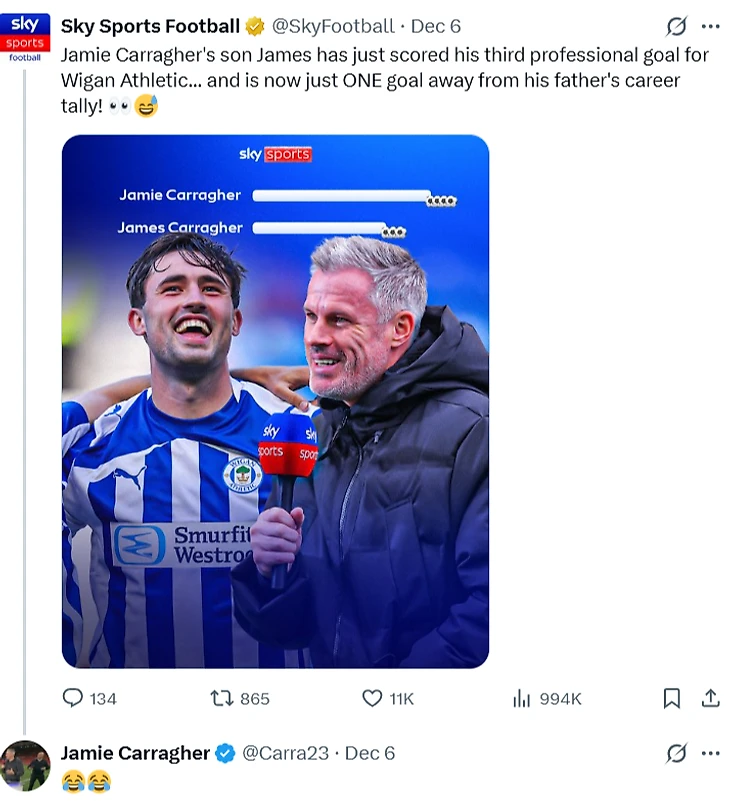 «Сын Джейми Каррагера только что забил свой третий профессиональный гол за «Уиган», теперь он всего на один гол отстает от результатов своего отца за всю его карьеру 👀😅».