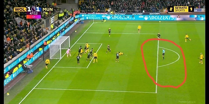 Все четыре опасных момента «Вулвс» создал именно в этот шаблон. Не потому, что они нашли “один момент”, а потому что «Юнайтед» просто не играет переходы как система. По сути, пропущенный гол — это логичный итог. До гола было четыре идентичных эпизода, и в одном из них проявился критический сбой: оба номинальных опорных полузащитника, Бруно и Каземиро, опустились слишком низко, практически в штрафную. В результате центральная зона прямо перед штрафной оказалась полностью пустой и незакрытой. Более того, Каземиро своим движением пришёл закрывать позицию центрального защитника, где уже стоял партнёр. Это дублирование функции в линии обороны при опустошённом центре поля стало критическим системным разбалансом, который «Вулвс» немедленно использовали, что и привело к голу. Это не случайность — это  следствие