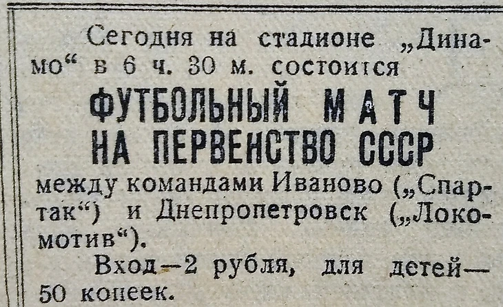 В июле 1937 г. Комитет по делам физкультуры и спорта при Совнаркоме СССР впервые включил ивановскую команду «Спартак» (тогдашнее название «Текстильщика») во всесоюзный розыгрыш по футболу, а 6 августа футболисты под руководством тренера А.Д. Жордании провели первый матч в рамках чемпионата, сыграв с днепропетровским «Локомотивом». Встреча прошла на стадионе «Динамо» (ныне - «Текстильщик») в присутствии десяти тысяч зрителей и завершилась со счетом 1:1.