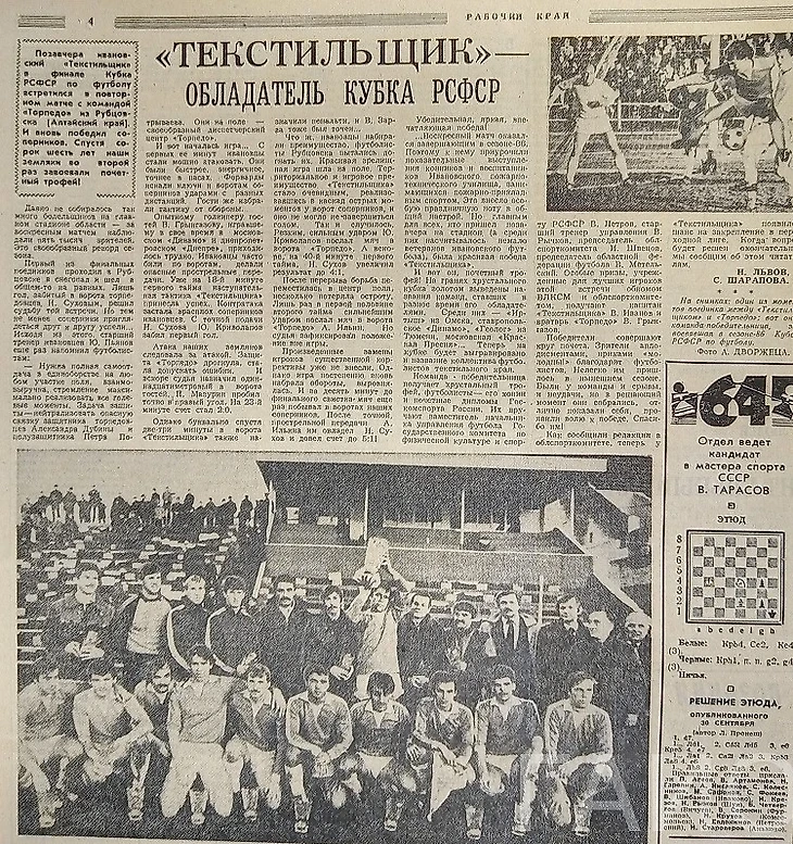 С этого дня ведет отсчет официальная история клуба. По итогам чемпионата ивановцы заняли 1-е место в группе «Д». Впоследствии команда не раз меняла название («Основа», «Динамо»,«Красное знамя»), привычное имя «Текстильщик» получила в 1958 г., в 1990-х и 2000-х годах некоторое время выступала под названиями «Иваново»,«Текстильщик-Телеком». Среди достижений команды — победа в Чемпионате СССР для команд второй лиги (1982 г.), второе (1981 г.) и третье (1964 г., 1987 г.) места в Чемпионате РСФСР, победа в розыгрыше Кубка РСФСР (1940 г., под названием «Основа»), Кубка РСФСР для команд второй лиги (1986 г.). В нынешнем сезоне «Текстильщик» выступает в первенстве России по футболу среди команд второй лиги (ФНЛ-2).