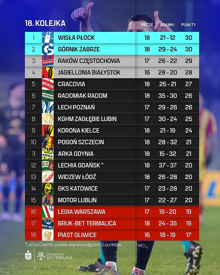 В Экстракласе матчами восемнадцатого тура стартовал второй круг, лидировавший в таблице «Гурник» снова проиграл и опустился на вторую строчку, «Ракув» одержал очередную победу, а «Легия» приближается к историческому антирекорду.