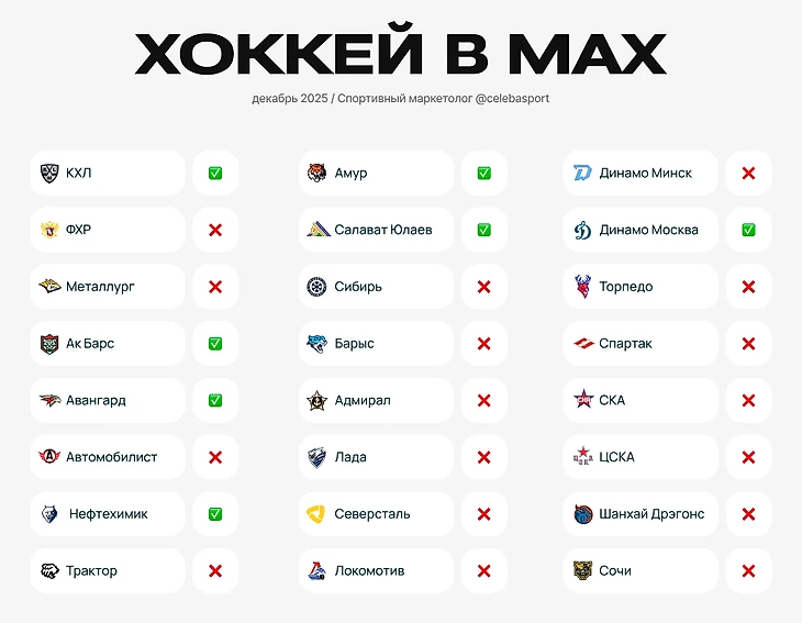 В отличие от РПЛ, аккаунт КХЛ уже во всю раскачивается в MAX. Но клубы идут в национальный мессенджер неохотно: всего лишь 6 из 22 команд завели свои каналы. Но самое интересное, что в MAX нет канала ФХР: интервью Ротенберга пока выходят в других соцсетях.