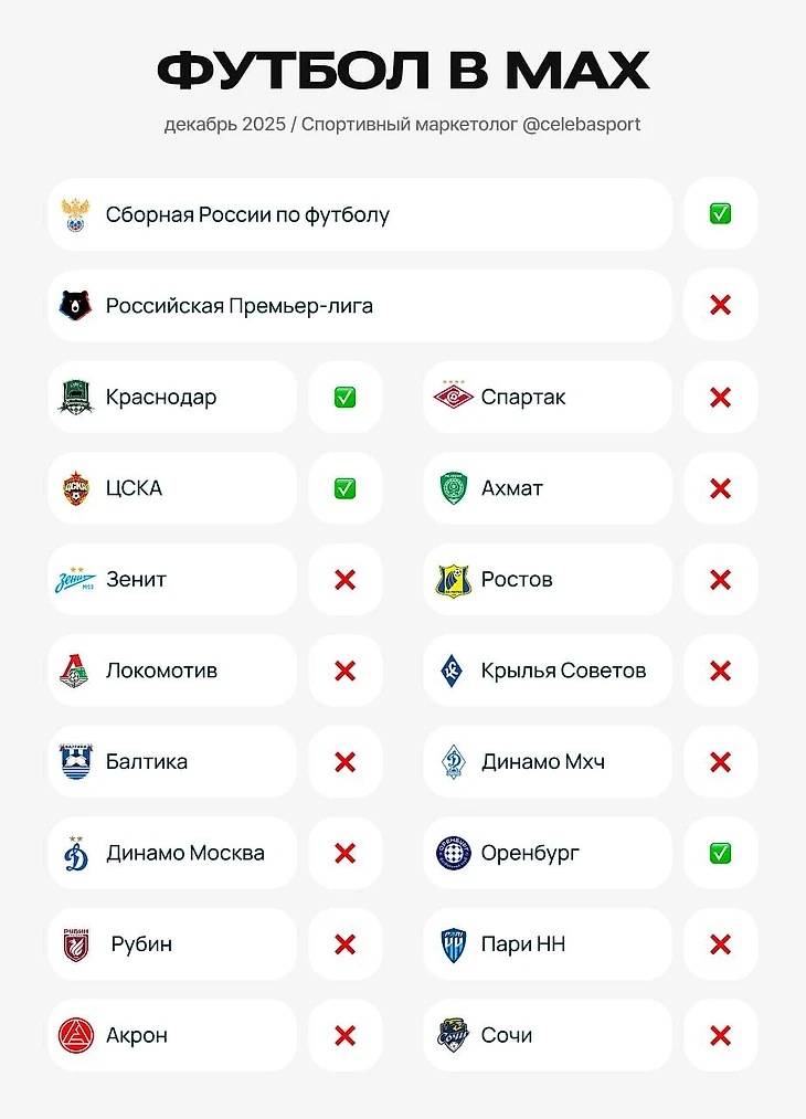 Когда искал российские клубы в MAX, признаюсь, ожидал большего. Но нашел всего лишь 3 клуба из 16. И при этом, не самых очевидных: «Краснодар», ЦСКА и «Оренбург». Самой лиги в MAX нет, хотя официальный ник @premierliga забронирован еще с октября.