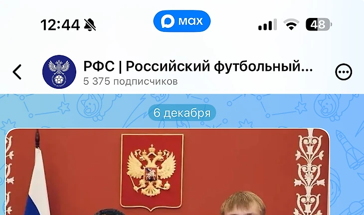 Аккаунт в MAX есть и у РФС, но в отличие от канала Сборной России по футболу, ведется он неактивно. На момент написания статьи (10 декабря), последняя публикация в MAX у РФС датирована 6 декабря.