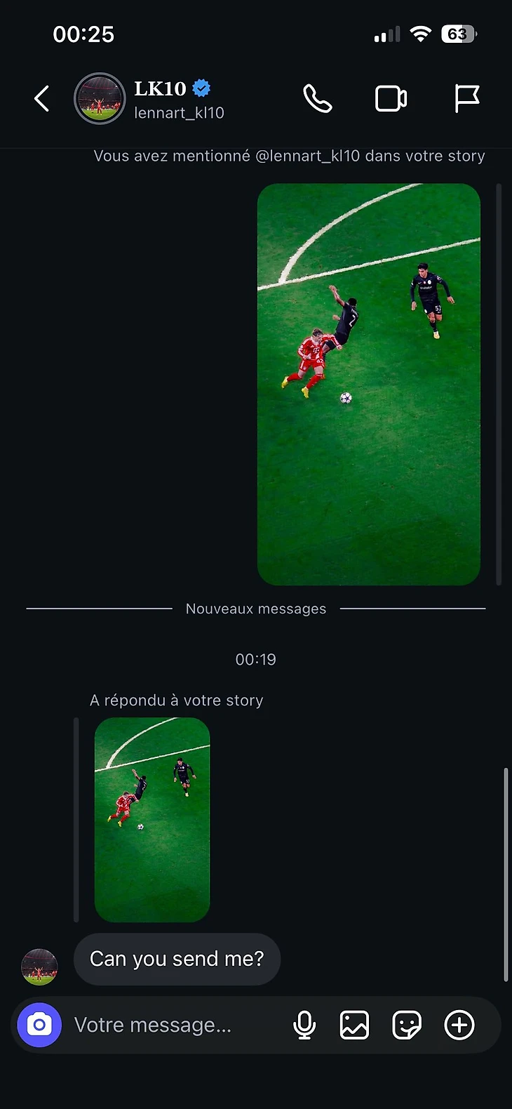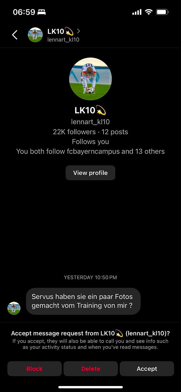 Юноша при этом остается достаточно скромным. Фанатский аккаунт мюнхенцев поделился перепиской с Леннартом – игрок просил скинуть ему фотографию, сделанную болельщиком с трибун «Альянц Арены» на матче против «Спортинга»: