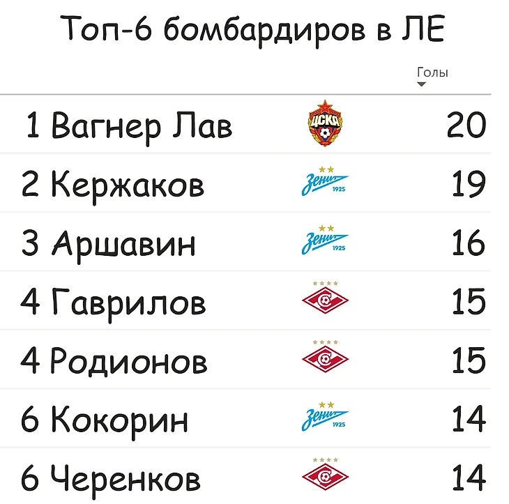 * с учетом выступлений за «Динамо», у Кержакова выходит 20 голов, а у Кокорина 19 голов.