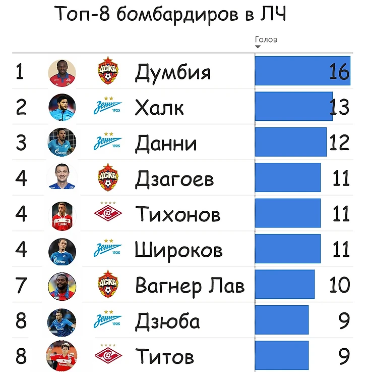 На вершине списка лучших бомбардиров российских клубов в Лиге чемпионов — Сейду Думбия с 16 голами за ЦСКА Москва. Следом идет Халк с 13 голами, забитыми за «Зенит». На третьем месте — Данни с 12 голами за «Зенит» в Лиге чемпионов, не менее важная фигура для петербургского клуба. Также в числе лучших бомбардиров: Алан Дзагоев (ЦСКА), Андрей Тихонов («Спартак»), Роман Широков («Зенит»), Вагнер Лав (ЦСКА), Артем Дзюба («Зенит») и Егор Титов («Спартак»).