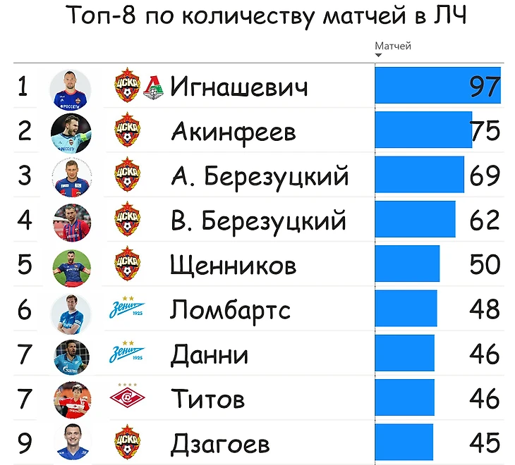 В топ-5 бессменный голкипер и четверка защитников московских армейцев. Сергей Игнашевич – единственный, кто попал в топ-5 по количеству матчей сразу в двух клубах (30 матчей за «Локомотив», 67 за ЦСКА Москва), играл в Лиге чемпионов с 2001 по 2018 год.