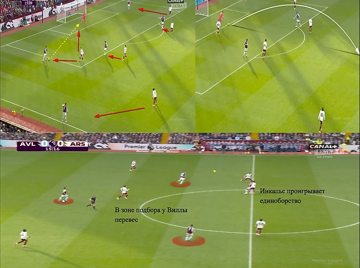 Атака. В атаке Вилла поначалу пыталась играть в своем стиле, строить игру через билд-ап с короткими передачами, но Арсенал давал приличное давление, заставлял Виллу играть длинно, и эта длинна начала работать! Сначала Уоткинс а потом Маллен достаточно часто выигрывали борьбу у ЦЗ Арсенала и Вилла развивала атаки быстро и вертикально либо сохраняла мяч и садила Арсенал за линию мяча в средний блок. Также Вилла была опасна в переходах, опять же потому что ЦЗ Арсенала проигрывали борьбу и давали нападающему сохранить и скинуть мяч своим.
