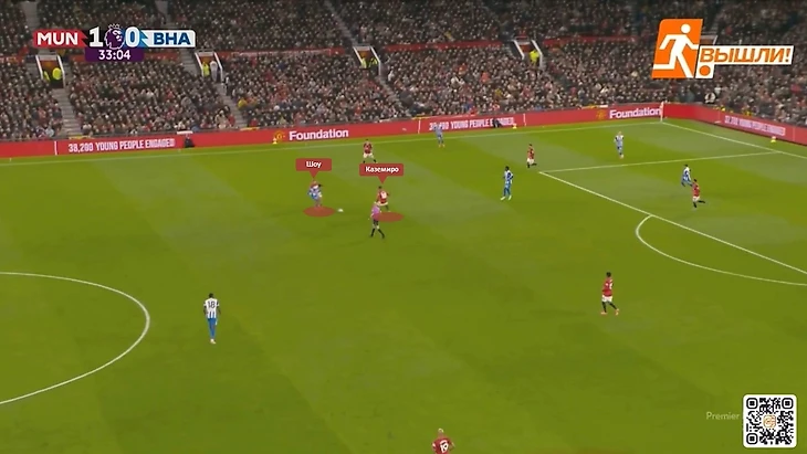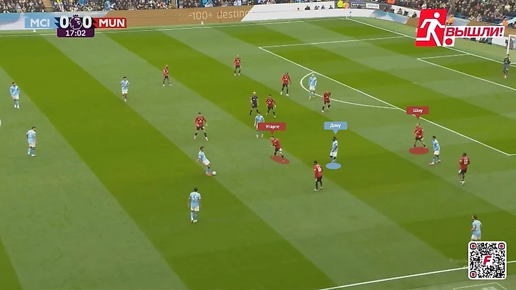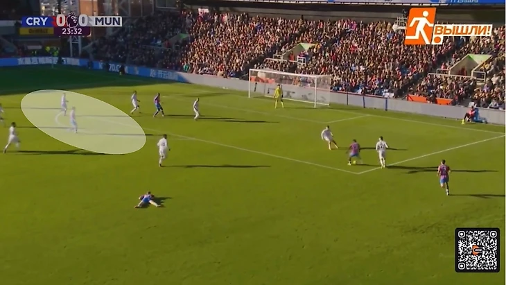 С этой проблемой команда сталкивается с незавидной регулярностью. Учитывая, что подобные моменты встречаются, как правило, в быстрых атаках или после успешного прохождения соперником высокого прессинга манкунианцев, причину стоит искать в том, что (1) игроки опорной зоны не успевают выполнять большой объем перемещений и (2) их качественные характеристики к этому не располагают: Бруну имеет явный атакующий уклон (вспоминаем пропущенный мяч от «Фулхэма», Каземиро уже не может покрывать такие дистанции все 90 минут, а Угарте из раза в раз допускает позиционные ляпы.