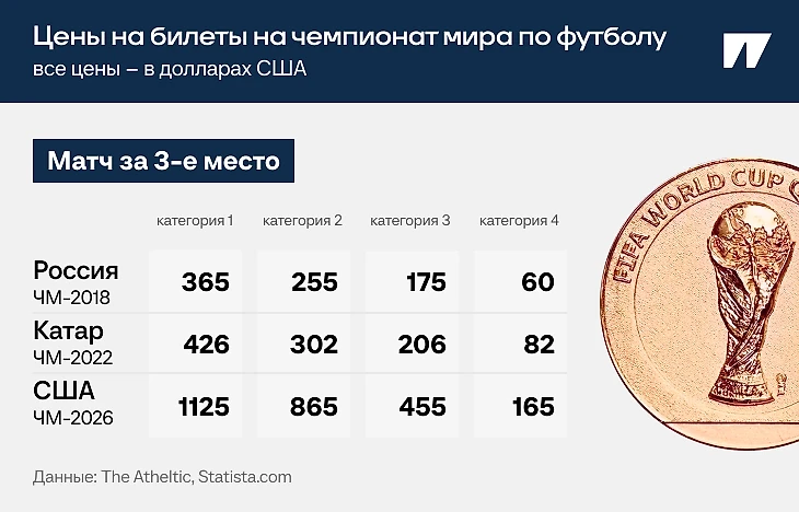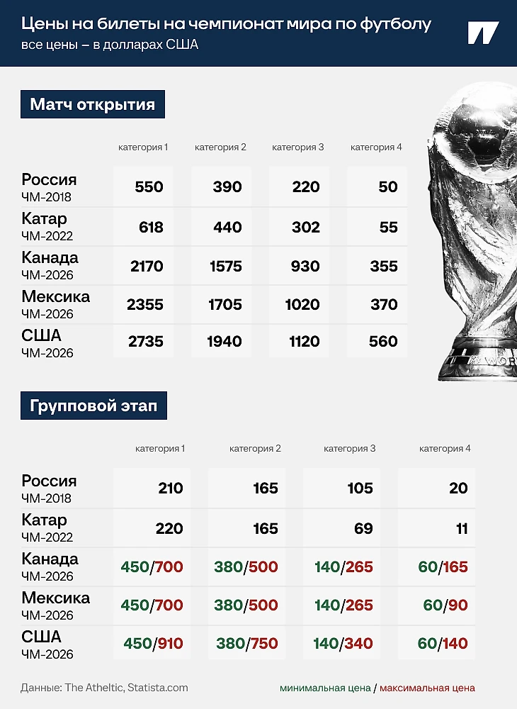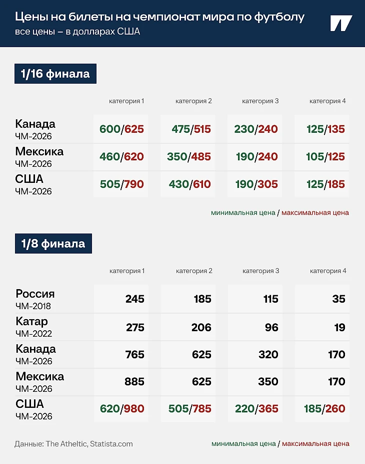 ● Матчи ЧМ-2026 будут проводиться на разных стадионах, и на каждую игру установлена своя цена билетов. Поэтому стоит рассматривать минимальные и максимальные значения.