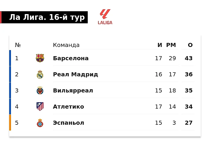 Но не все так просто: «Барса» и «Атлетико» сыграли 19-й тур заранее – из-за январского Суперкубка Испании. Ближайший преследователь прямо сейчас – «Реал», но по потерянным очкам совсем рядом и «Вильярреал».