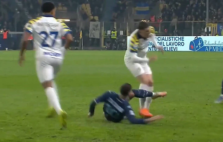 Больше тайма «Лацио» отыграл вдесятером, потому что еще на 42-й минуте судья Маттео Маркетти удалил полузащитника Маттиа Дзакканьи за фол на Науэле Эстевесе. Вероятно, за опасную игру, за намерение: прямого удара шипами нет.