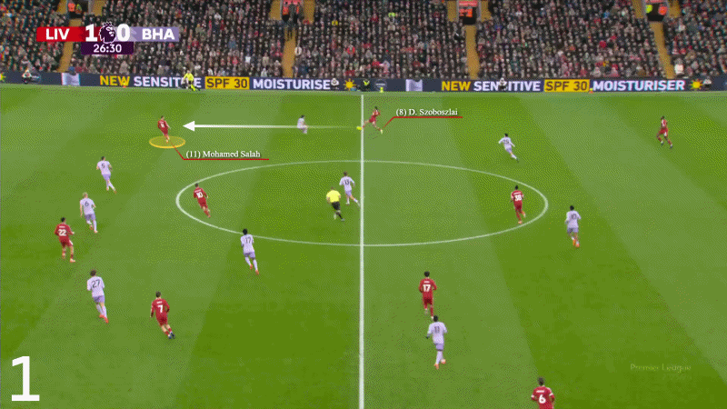 В первом тайме Кадиоглу отправил пасом Гомеса за спину Собослаи. Трудно винить в этом Салаха, хотя он и предоставил защитнику «Брайтона» слишком много времени для того, чтобы тот смог реализовать свой пас. Это было скорее связано с понятным отсутствием у Собошлаи, как у правого защитника, понимания позиционной игры. В итоге это привело к тому, что Брайан Груда пробил мимо цели.