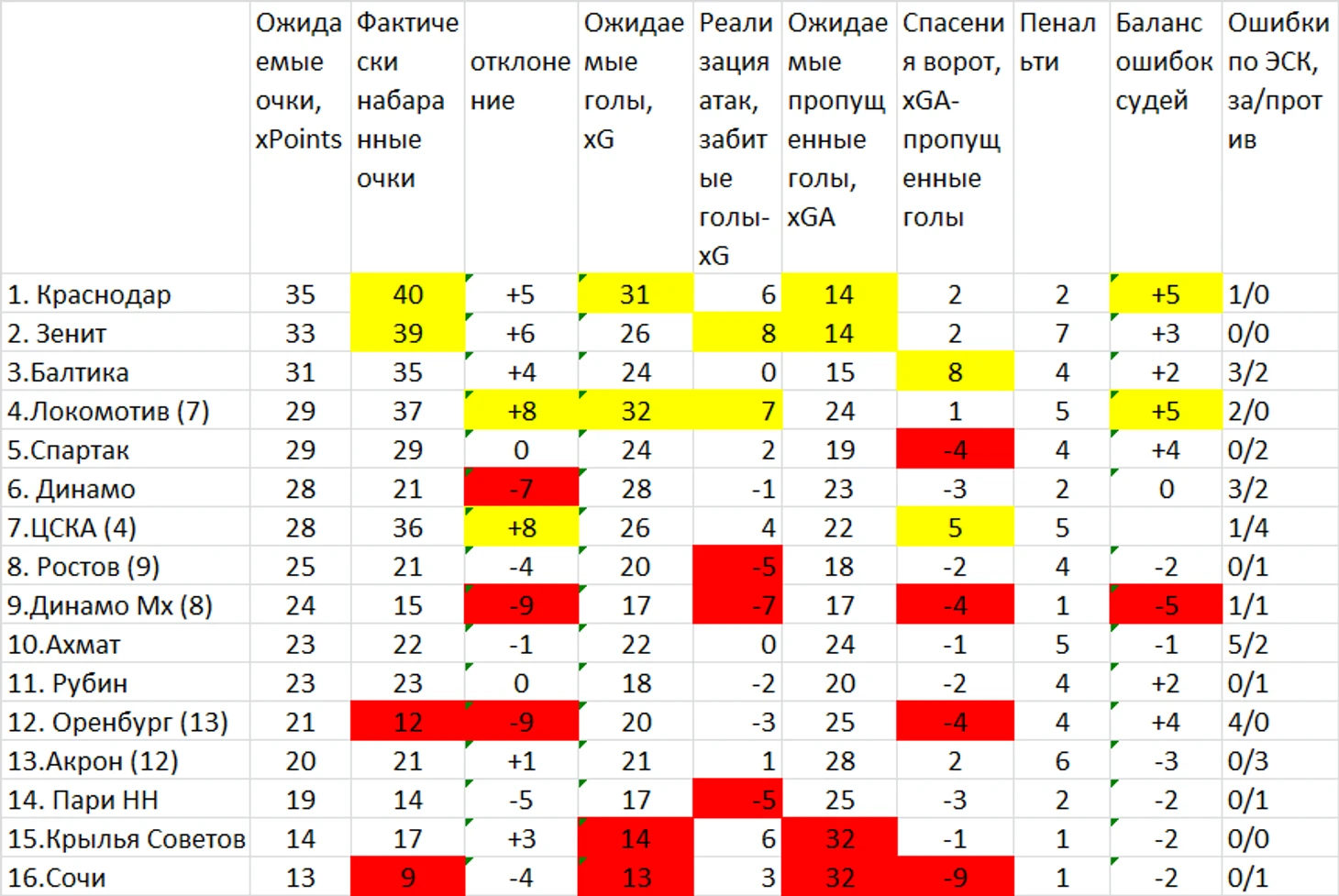 Традиционный итоговый разбор положения клубов в РПЛ по ожидаемым очкам xPTS как обычно начнем с объединенной таблицы показателей продвинутой статистики и судейских пристрастий. Места в таблице клубы занимают исходя из суммы ожидаемых очков xPTS. Красным выделены по 2 худших результата по каждому параметру, золотым - по 2 лучших. Баланс судейских ошибок для ЦСКА не указан, дабы болельщики других команд не возбуждались. В таблицу для большей наглядности внесены ставшие уже постоянными дополнения. В частности, поскольку в итоговом обзоре сезона прошлого мы установили очень большое влияние количества пенальти в пользу одной (или нескольких) команд относительно среднего показателя по турниру на ожидаемые очки xPTS, их количество представлено отдельным столбцом. Также присутствует столбцы с «ошибками судей». Они разделены на 2 раздела. Первый - ошибочные по Правилам игры в изложении IFAB Board. Второй - признанные ошибками в Решениях ЭСК. Включены в «ошибки» только результативные: КК, вторые ЖК, голы и пенальти.