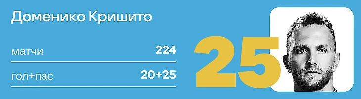 В «Зенит» Кришито переходил игроком сборной Италии – и все поняли уровень Доменико уже в дебютном матче с ЦСКА в августе 2011-го (2:0). Если бы не несправедливое отстранение от Евро-2012 и травма крестов в 2013-м, карьера Кришито вышла бы еще успешнее, но и так его семь лет в «Зените» получились счастливыми. Доменико немного просел в период Виллаш-Боаша, но возродился при Мирче Луческу (даже на позиции центрального защитника) и Роберто Манчини – в отличие от большинства партнеров.