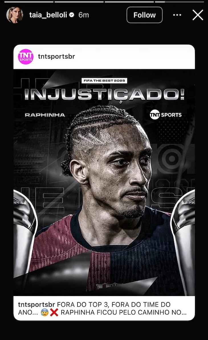 Но Рафинья и тут не попал в топ-3, после чего Наталия репостнула публикацию TNT Sports с изображением бразильца и подписью «Несправедливо!»