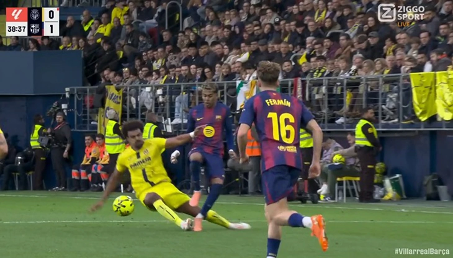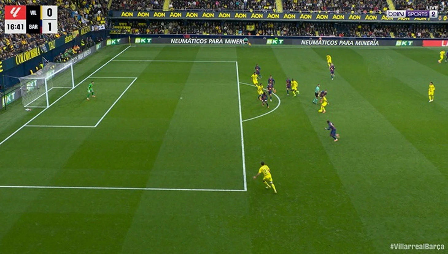 Далее последовала перестрелка с попаданием в каркас ворот от Рафиньи и ударами Тайона Бьюкенена, которые нивелировал Гарсия. Частые забросы партнеров на Пепе за спины защитников сине-гранатовых заставляли оборону гостей вздрагивать каждый раз, смотря в сторону лайнсмена. Он попеременно то поднимал флажок вверх, то оставался неподвижным. Стоит заметить, как команда Марселино использовала контрпрессинг, «Барселоне» не удавалось спокойно выходить на чужую половину поля. Эта тренерская задумка прекрасно работала, и казалось, что «Вильярреал» найдет свой гол в конце тайма, но случилось столкновение Ямаля и Вейги, после которого игрока жёлтой субмарины удалили.