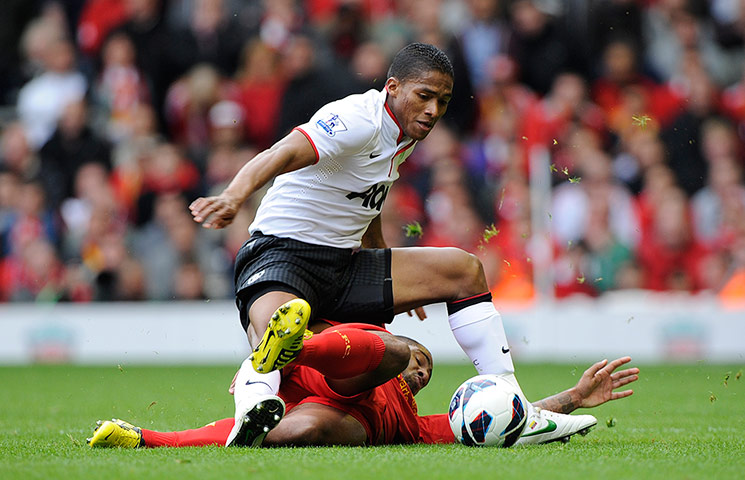 Глен Джонсон пытается отобрать мяч у Антонио Валенсии.