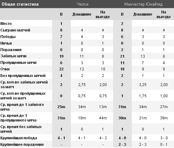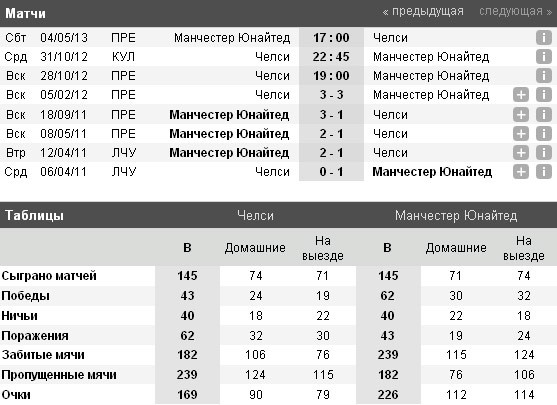Но проблемы в защитной линии есть и здесь. Точнее эта проблема одна – дисквалификация Джона Терри. Потеря сравнима с Видичем, потому и большого значения этому придавать не стоит. Также возможно не сыграет и Лэмпард, что может стать небольшим подспорьем. Хотя главный козырь у соперников, конечно же, в другом – в стадионе. Вот тут-то «Юнайтед» не побеждал давно. Можно вспомнить матч ЛЧ двух летней давности, но мы-то говорим о чемпионате. Однако, всё это можно забыть как страшный сон, удачно сыграв сегодня.