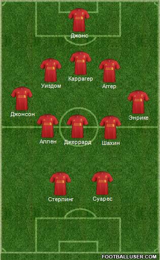 Джонс - Джонсон, Уиздом, Каррагер, Аггер, Энрике - Аллен, Джераррд, Шахин - Стерлинг, Суарес