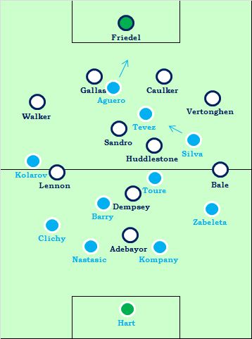 В основном, “Манчестер Сити” используют такую тактику игры в нападении: Карлос Тевез играет в оттяжке, и он должен выманивать защитников из их зон, в которые врывается Кун Агуэро. Такая же тактика была применена в игре с “Тоттенхэмом”. Поэтому игра с высокой линией защиты, была ошибкой со стороны Андре Виллаша Боаша.