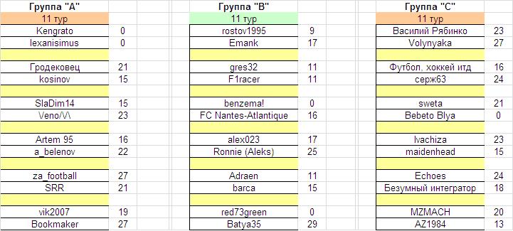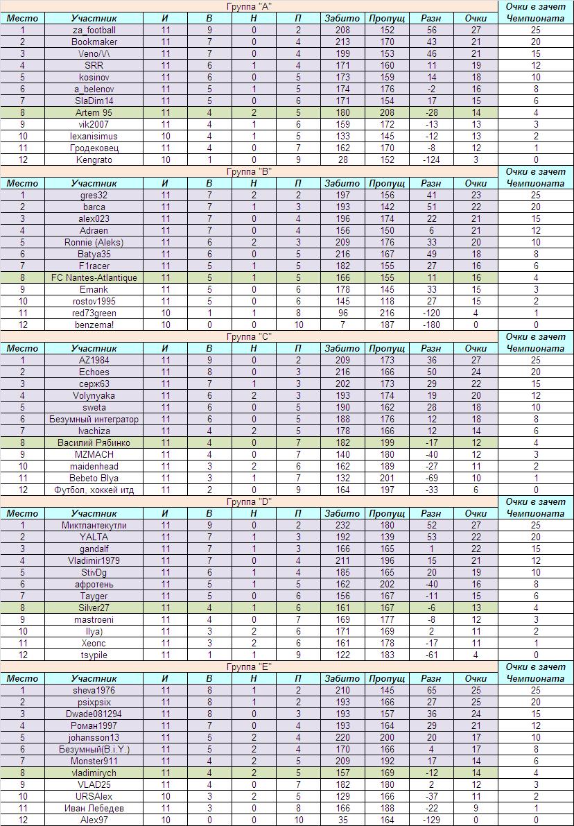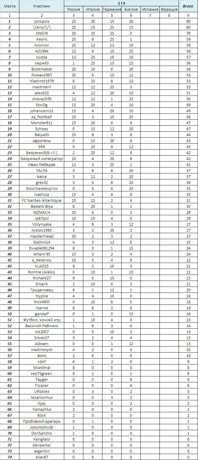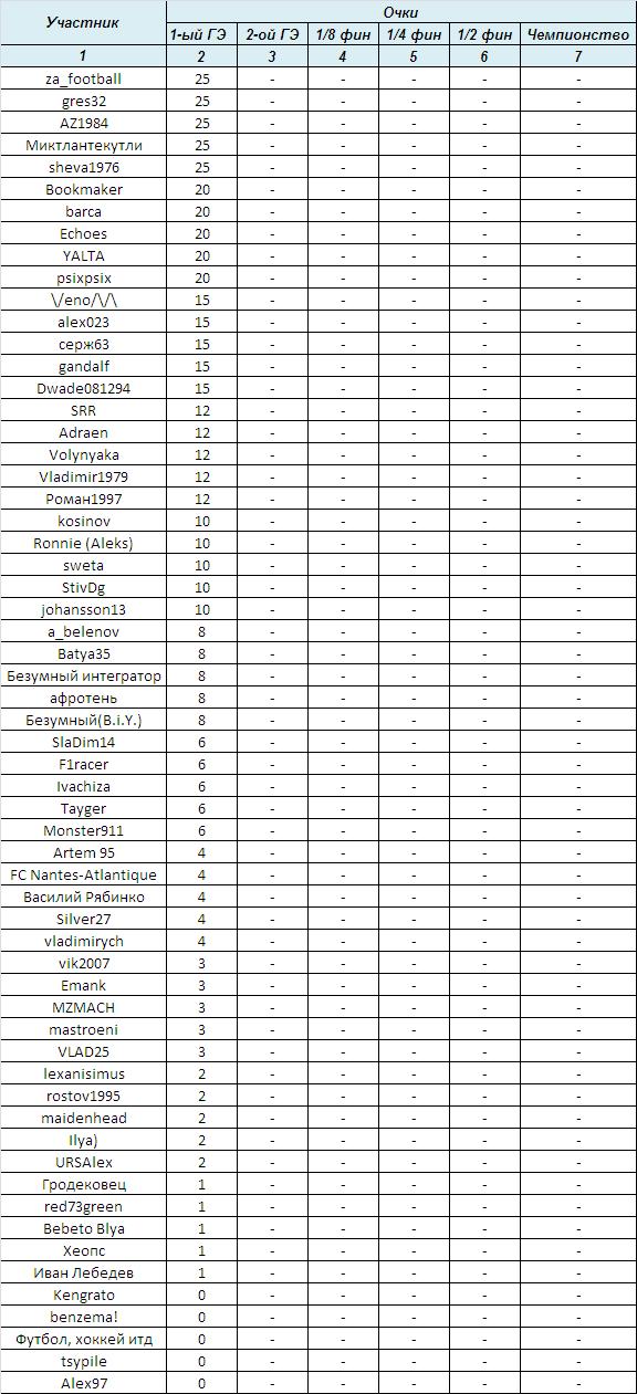Общий зачет Чемпионата "Футбольная интуиция" на данный момент, перед завершением 1 ГЭ по Испании и Франции выглядит так: