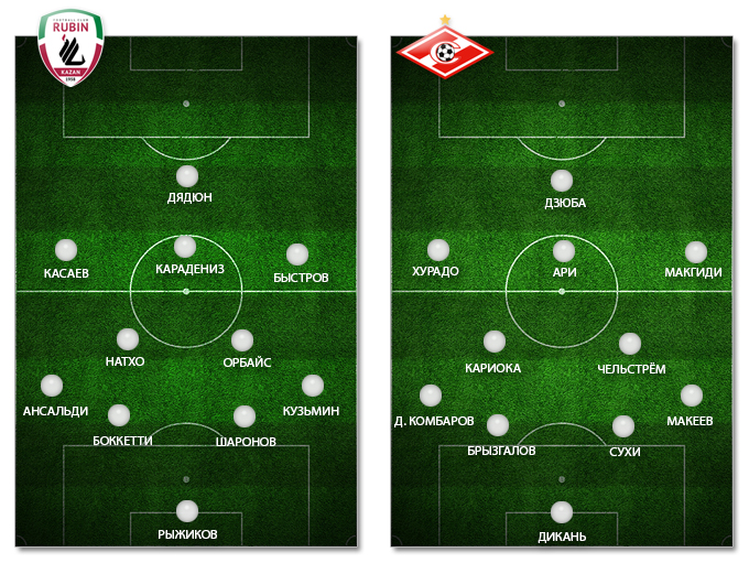 "Спартак": Дикань – Макеев, Сухи, Брызгалов, Д. Комбаров – Кариока, Чельстрём – Макгиди, Ари, Хурадо – Дзюба.
