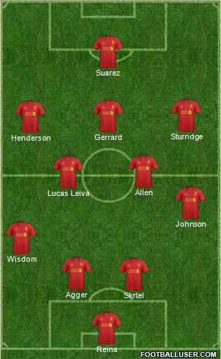 Ориентировочный состав: Рейна – Уиздом, Аггер, Шкртел, Джонсон – Аллен, Лукас Лейва, Джеррард, Хендерсон – Старридж, Суарес