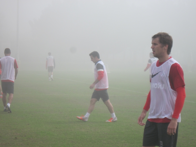 А ведь погода по сравнению с предыдущими днями несколько изменилась: на Абу-Даби опустился туман, и при палящем, как прежде, солнце ощущения даже у стоявших у кромки репортёров были, словно в парной. Удивительно, что игроки, казалось, не обратили на это никакого внимания – хотя ещё и не видно порой было ни зги. Вот, например, картинка "Дмитрий Комбаров в тумане":