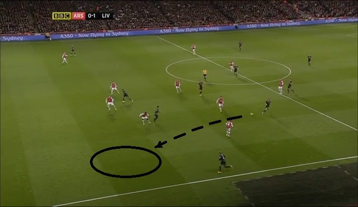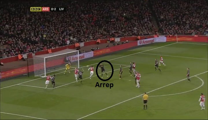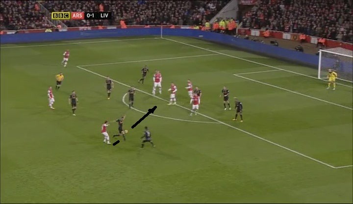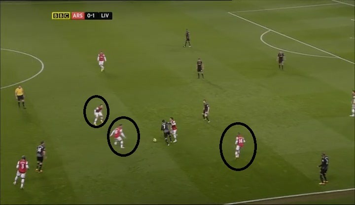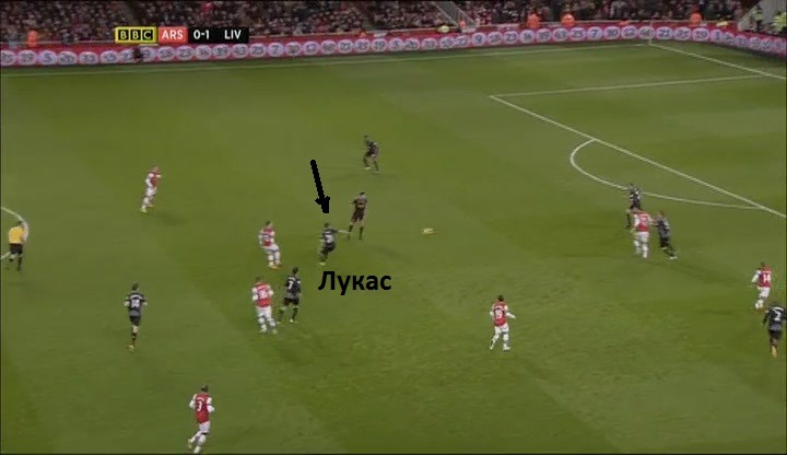 Здесь всё началось с потери мяча в центре поля. Посмотрите как канониры окружили Луиса. Уругваец в итоге мяч потерял.