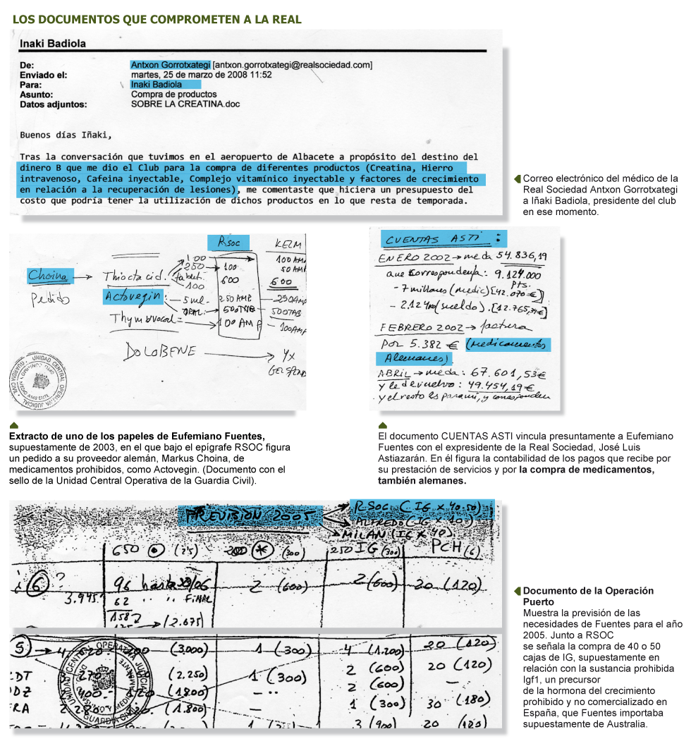 Рукописный документ, почерк в котором очень похож на почерк Эуфемиано Фуэнтеса, может стать ключевым паззлом мозаики, необходимым для решения одной загадки, связанной с известной «Операцией Пуэрто»: что значит сокращение RSOC, фигурирующее в нескольких документах канарского врача? Вопросов стало еще больше после недавнего заявления газете AS Иньяки Бадиолы, бывшего президента футбольного клуба «Реал Сосьедад» (2008 год), в котором он сообщил, что на специальном собрании акционеров клуба в марте 2008 года было выяснено, что в течение долгого времени «определенная часть «черной» прибыли (счет шел на тысячи евро) тратилась на приобретение медикаментов и оплату услуг Фуэнтеса». Период этот продолжался с 2001 по 2005 гг, во время президентства Хосе Луиса Астиасарана. В указанные сезоны «Реал Сосьедад» занимал 13, 2, 15 и 14 места в Примере, соответственно.