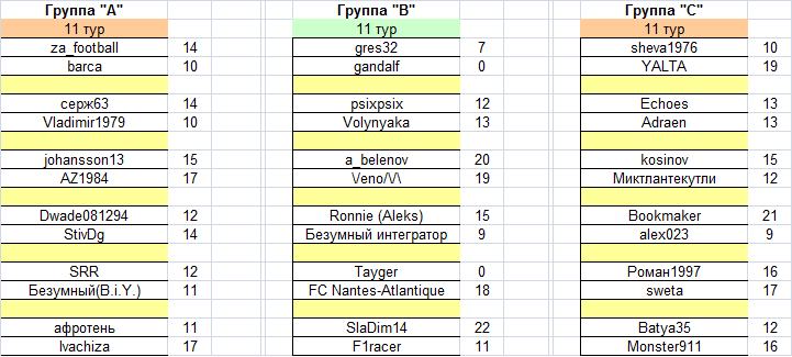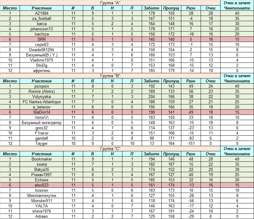 Более темным цветом выделены участники, занявшие 6-е места и претендующие на единственную оставшуюся путевку в 1/8, которую получает (опять-таки, с использованием Принципа*) ... SlaDim14, у которого 18 очков против 16 у его оппонентов из соседних групп.