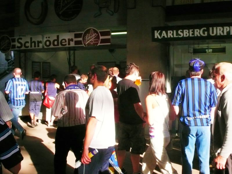 Как и во всей Германии, болельщики активно едят и пьют на стадионе, особенно до матча и в перерыве. Едят, разумеется, сосиски со свежими булочками, а пьют… Любовью пользуется не только местное саарландское пиво “Karlsberg“, которое, честно говоря, опровергает тезис о том, что в Германии варят только отличное пиво, но также наблюдается большой спрос на напиток под названием “bierkola“: половина стакана – кока-кола, вторая половина – пиво. Вкус своеобразный, но пить можно, в некотором смысле даже с удовольствием...