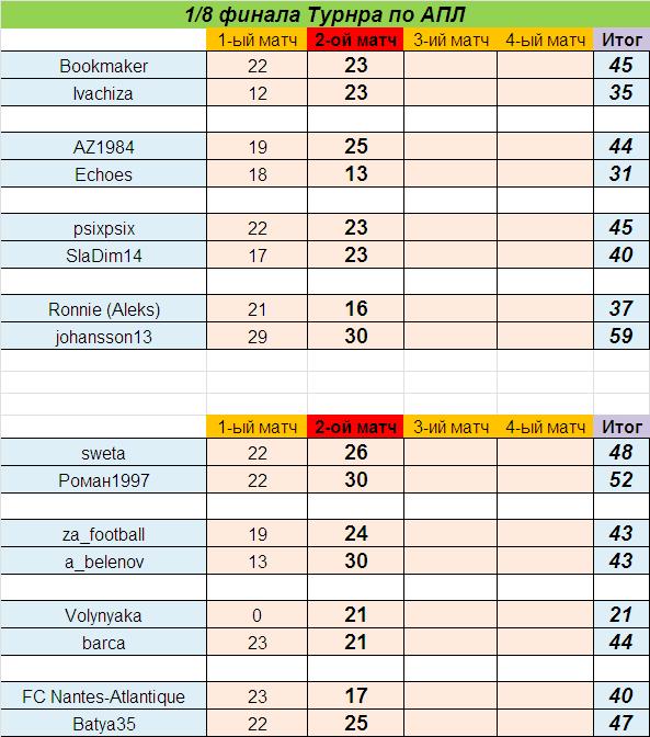 В рамках прошедшего 27-го тура Чемпионата Английской Футбольной Премьер-Лиги состоялись 2-е матчи 1/8 финала Турнира по АПЛ, которые завершились следующим образом: