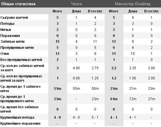 «Манчестер Юнайтед» и «Челси» встречались между собой 166 раз во всех турнирах. 45 побед на счету «Челси», 72 встречи выиграл «Юнайтед», и 39 игр завершились вничью.