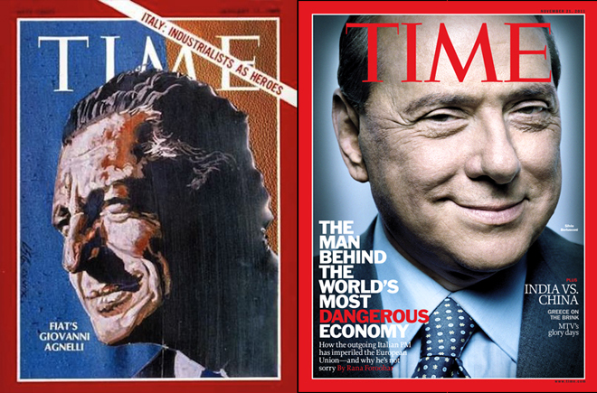 Джанни Аньелли, предприниматель, 1969 год. Заголовок: «Италия. Предприниматели как герои». Бывший премьер-министр Италии Сильвио Берлускони на обложке в 2011-м. К Италии уже подползал кризис.