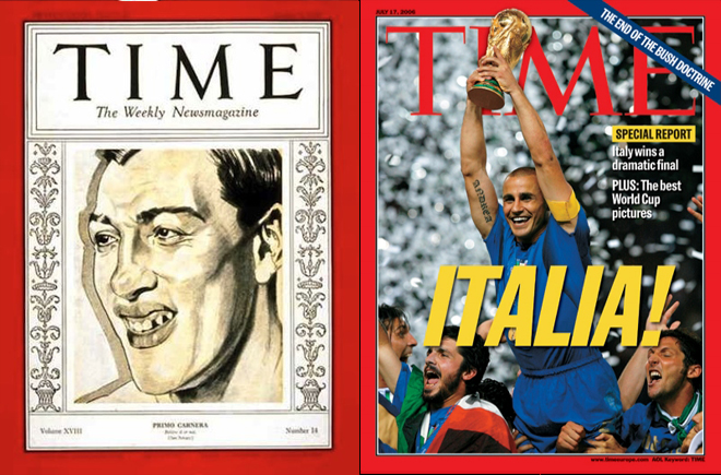 Примо Карнера появился на обложке в 1931 году. Чемпион мира в тяжелом весе. Чемпион Мира-2006 сборная Италии попала туда после победы в финале над Францией.