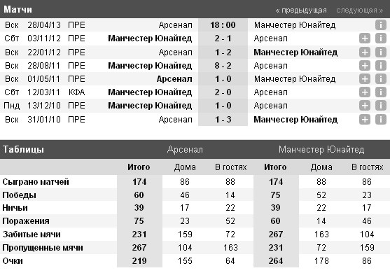 Всего клубы встречались 216 раз во всех соревнованияъ. 91 раз побеждали игроки «Юнайтед», 79 раз «канониры».