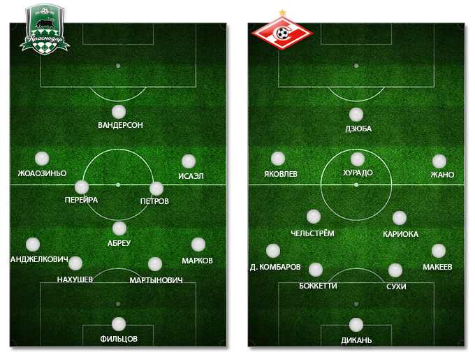 Ориентировочные составы:"Краснодар": Фильцов – Марков, Мартынович, Нахушев, Анджелкович – Абреу – Петров, Перейра, Исаэл, Жоаозиньо – Вандерсон.