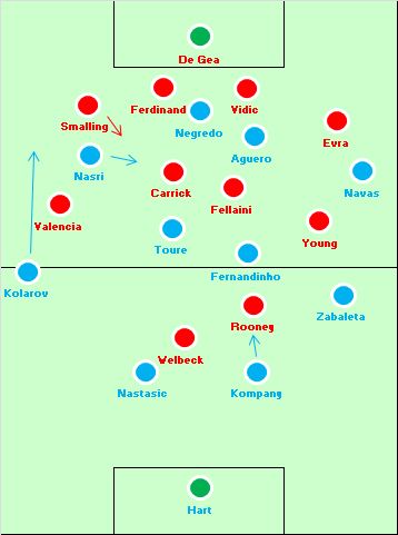 На самом деле левый фланг «Сити» должен был рассматриваться «МЮ» как слабое место – именно атакуя через эту зону они получили преимущество в два мяча в прошлогоднем аналогичном матче. К тому же Антонио Валенсия находился в неплохой форме. И, учитывая зачастую слабую игру Коларова в обороне, «Юнайтед» вполне мог надеяться, что их главные моменты будут созданы именно этим флангом.