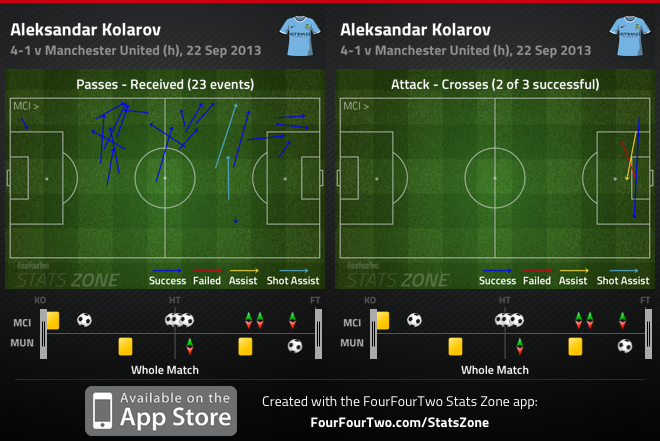 Коларов, что интересно, отдал меньше всех передач, из всех игроков, которые провели на поле все 90 минут (столько же только у Неманьи Видича), и точность его пасов была наихудшей из всех полевых игроков. Но он отлично выбирал моменты для забеганий по флангу, что и оголило проблемы «Юнайтед» в этой зоне.