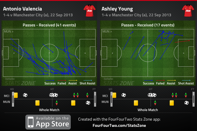 Очень похожие функции он выполнял и этой игре: в противостоянии 4-4-2 против 4-4-2 он по сути был единственным игроком, который на регулярной основе уходил со своей номинальной позиции и уводил за собой оппонентов. Его умное движение выделялось на фоне других фланговых игроков – Антонио Валенсия и Хесус Навас играли исключительно по флангу, а Эшли Янг провел очень невзрачный матч, часто теряя мяч на своем левом фланге. Насри не играл в роли вингера, он смещался в центр и исполнял левого инсайда.