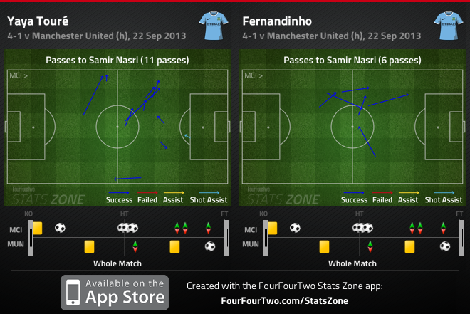 Одно из следствий этого было очевидным – обе команды использовали по два центральных полузащитника, поэтому смещения Насри в центр давали «Сити» численное преимущество в этой зоне и позволили выиграть борьбу за мяч в начале матча. У Фернандиньо и Туре всегда был вариант для паса вперед – Насри очень часто получал мяч именно от кого-то из них.